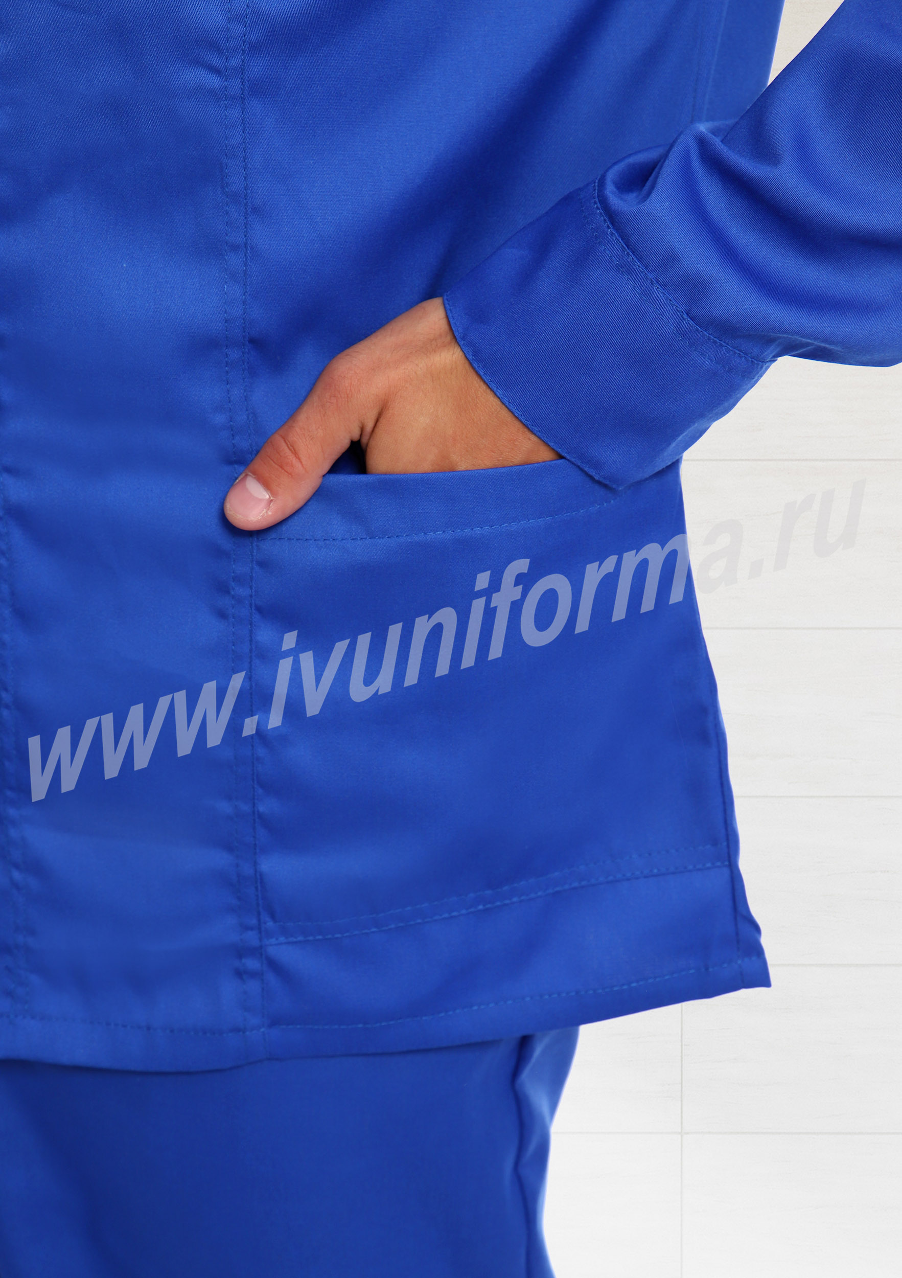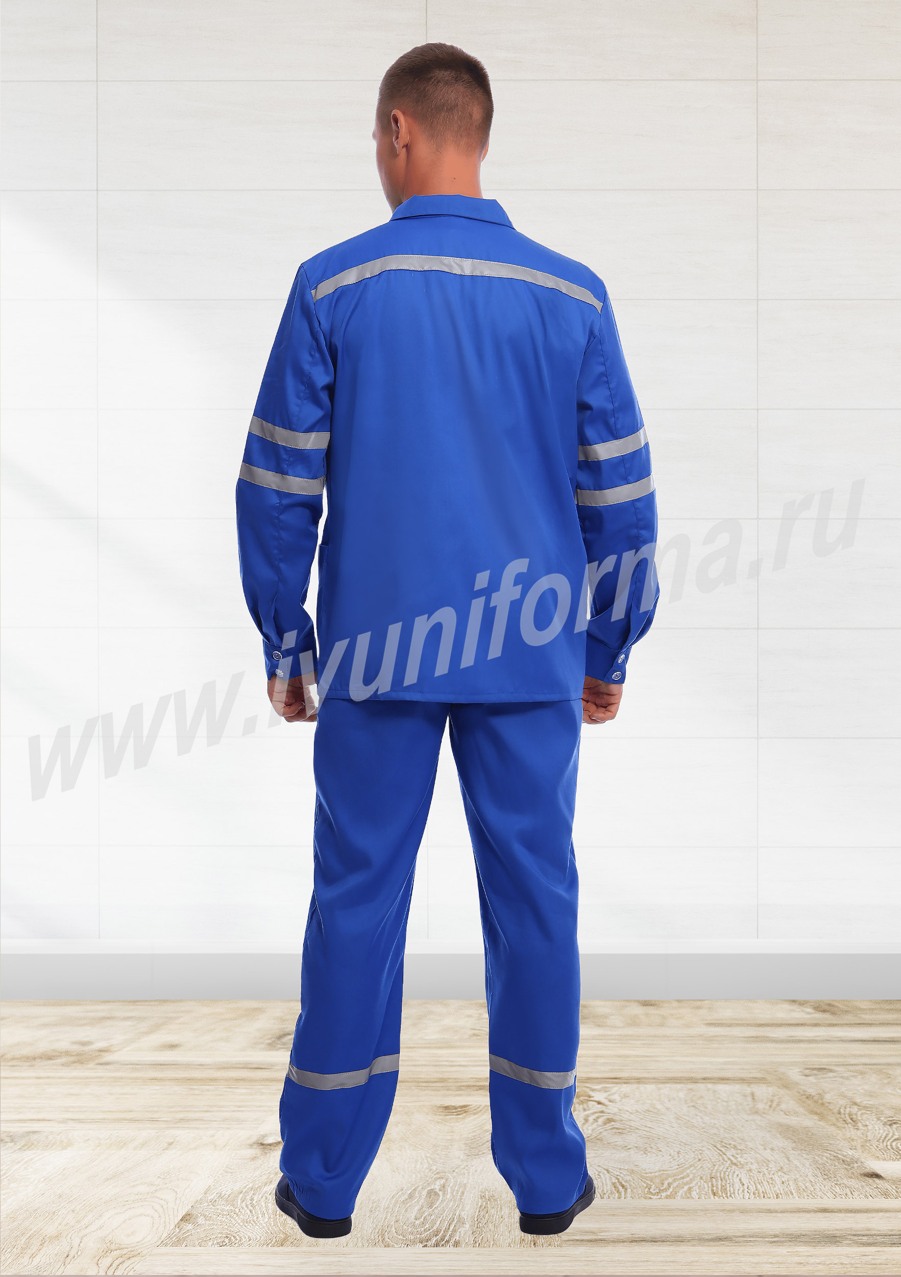 Костюм медицинский мужской состоит из куртки и брюк. Куртка удлиненная, прямого силуэта, с застежкой на пуговицы, с двумя нагрудными карманами с клапанами и застежками на липучку "Velcro", и двумя нижними накладными карманами. Рукав на манжете и застежкой на пуговицы. На передней части, спинке и рукавах расположены светоотражающие ленты. Брюки прямого силуэта с притачным поясом на эластичной ленте .На брюках два передних кармана с косой линией входа. Гульфик на молнии. По низу брюк расположены светоотражающие ленты.